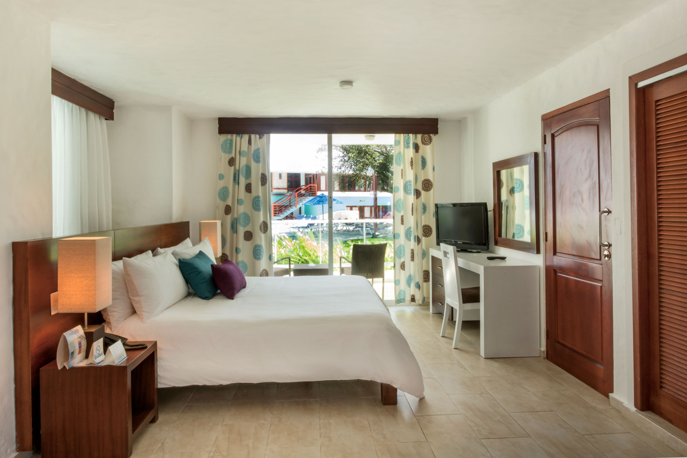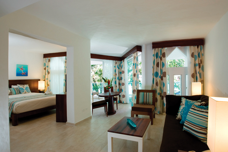 The suite garden at grand paradise playa dorada view accommodations offer a separate bedroom with king bed and walk in closet as well as a living area with kitchenette and balcony with garden view.